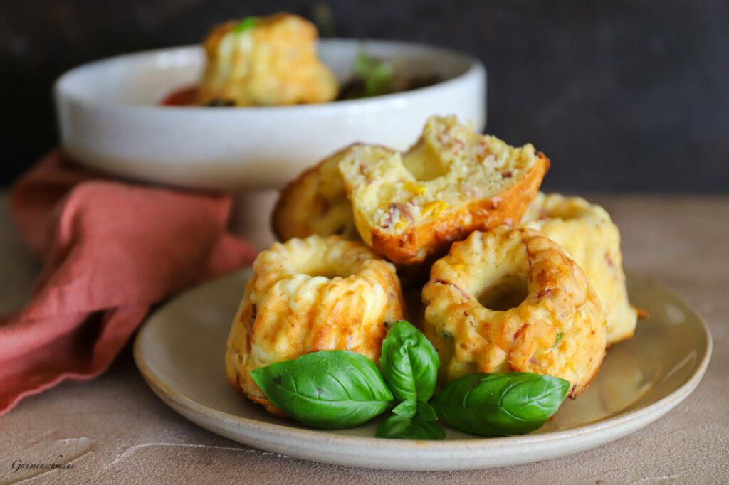 …für die Jause oder als Lunch im Salatnest serviert. Die köstlichen Mini Gugelhupf mit Speck, Mais und Schafskäse, sowie Kräuter