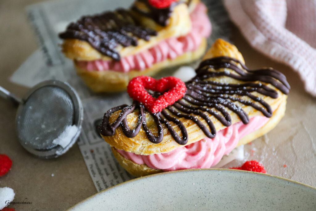 In wenigen Tagen steht Valentinstag wieder vor der Tür. Für heuer hätte ich wunderbare Eclairs mit feiner Himbeer-Puddingcreme und GUMA