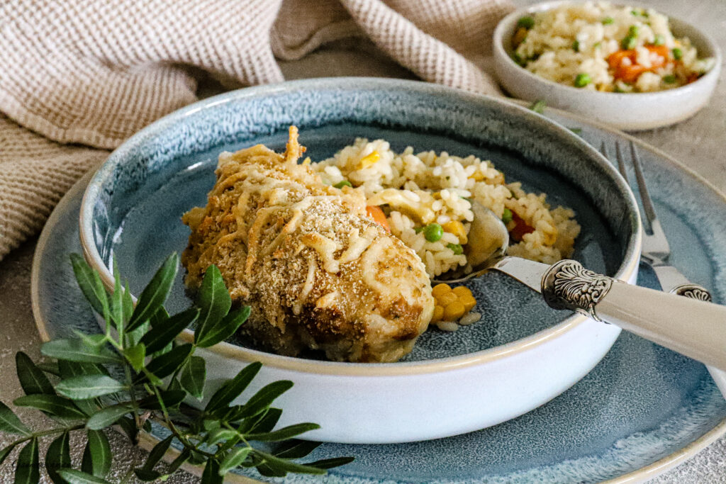Saftig, knusprig und sehr wohltuend. So schmeckt unser Ruck-Zuck Senfhendl aus dem Ofen. Dazu gibts Gemüsereis und hier lässt sich