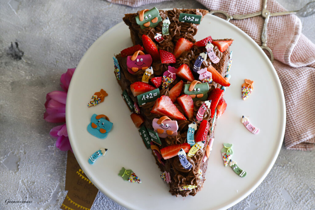 Würde unser Junior bald zur Schule gehen, hätte er diese Schultorte aus Schokobiskuit mit Schokomousse Creme, frischen Erdbeeren und diesem
