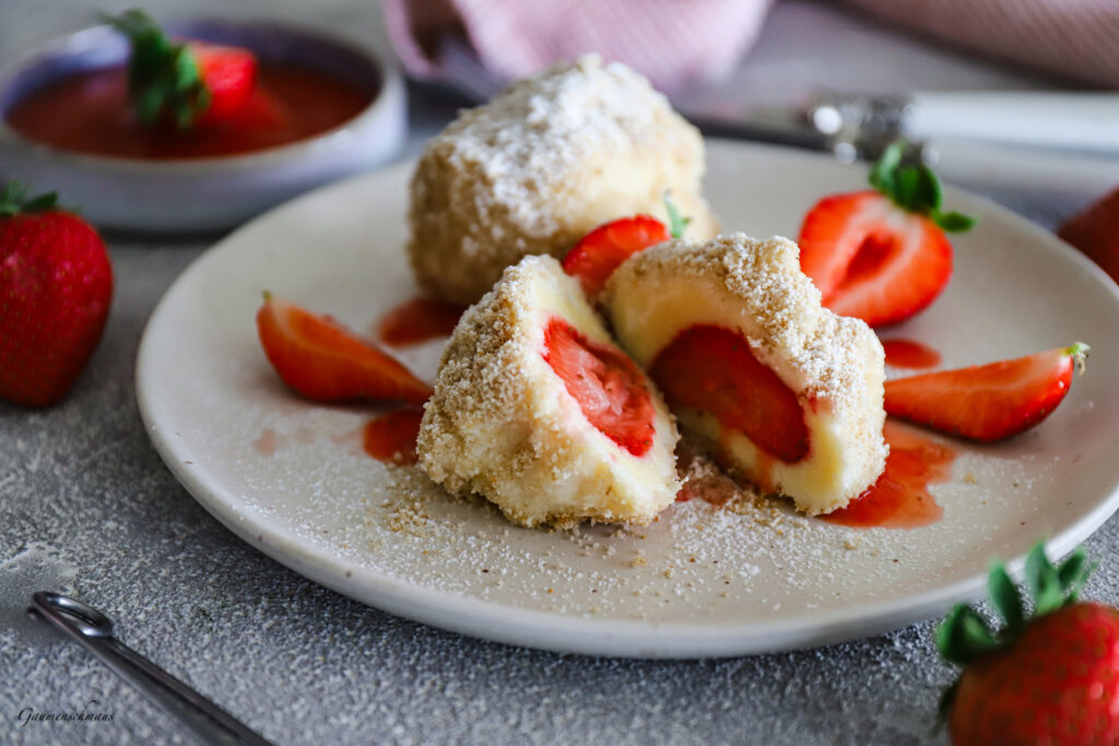 Ihr habt abgestimmt und euch heute für die Topfen-Erdbeerknödel entschieden. Gute Entscheidung übrigens. Die Masse für die Knödel habe ich