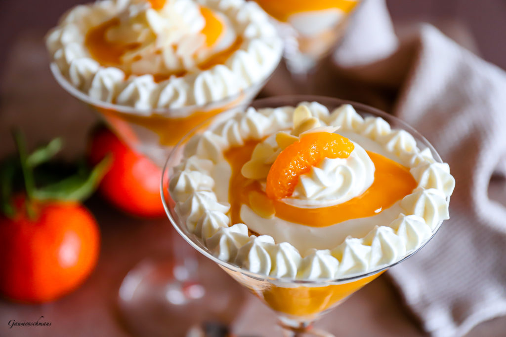 Das war unser Silvester-Neujahrs-Dessert. Eine fruchtige Mandarinen-Komposition mit Mascarpone-Topfen-Obers-Creme und gehobelten Mandeln verfeinert. Basis für dieses Glasdessert sind Biskotten bzw.