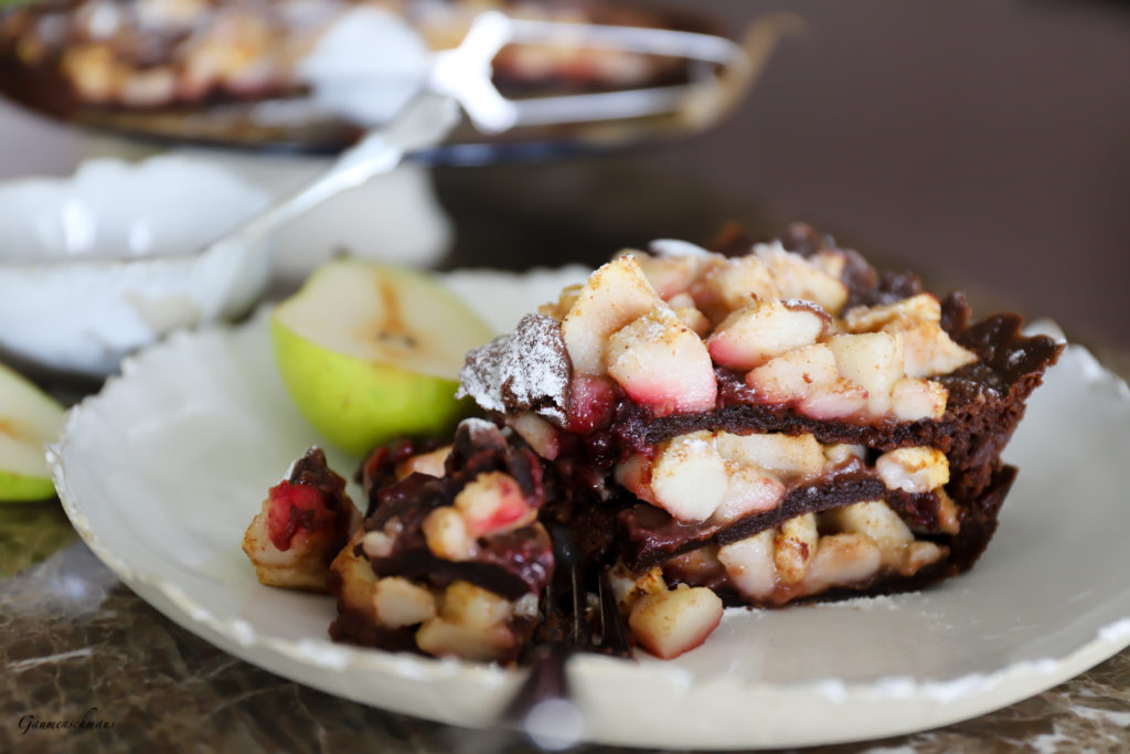 Passend zum Herbstwochenende gönnen wir uns diese saftige Angelegenheit. Mürber Schokoteig und saftig-fruchtiger Birnenbelag in Kombination mit hausgemachter Waldbeermarmelade. Alternativ