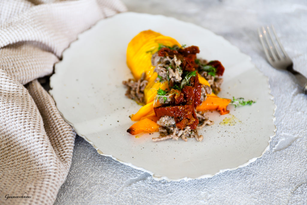 Das allerletzte Kürbisrezept für heuer geht in die Gänge. Kürbis-Hasselback mit cremiger Rahmsoße und Rindfleisch, sowie getrockneten Tomaten. Frische Kresse