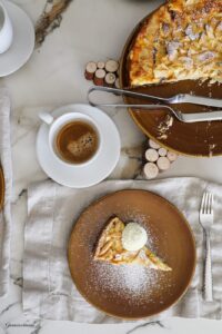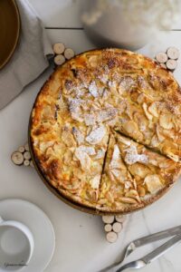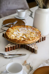 - Springform rausnehmen, Äpfel auf die Tarte schichten, mit dem Guss übergießen und 30-40 min auf unterer Schiene backen.