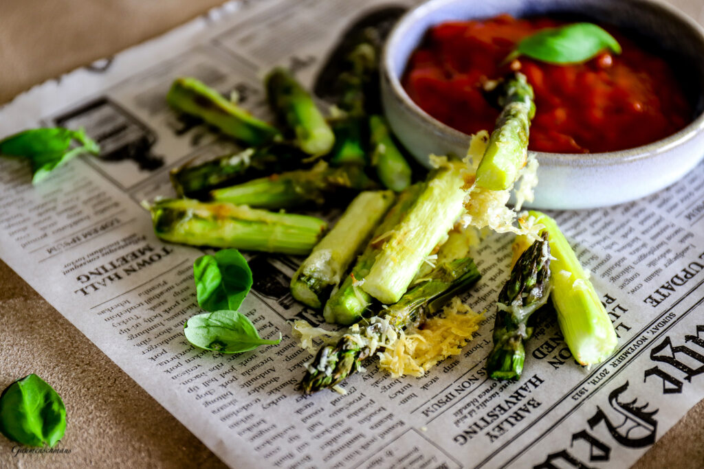 Jetzt in der Spargelzeit gibt es statt den klassischen Fritten die low carb/gesunde Variante von Pommes. Spargelpommes! Schon mal probiert?