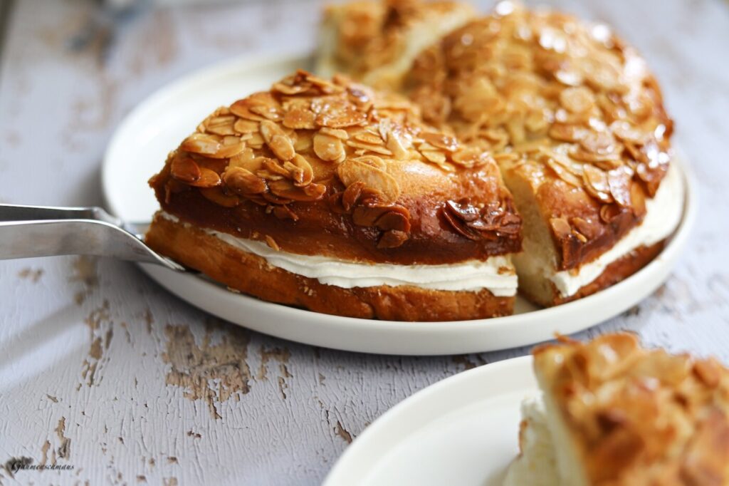 Bienenstich-Liebe zum Osterbrunch! Außen knusprig, innen weich – dieser Bienenstich begeistert mit zartem Hefeteig, goldbrauner Mandelkruste und einer traumhaft leichten