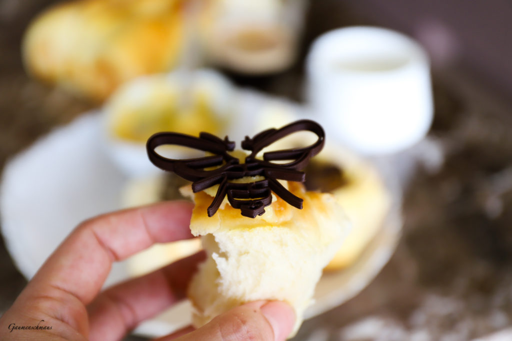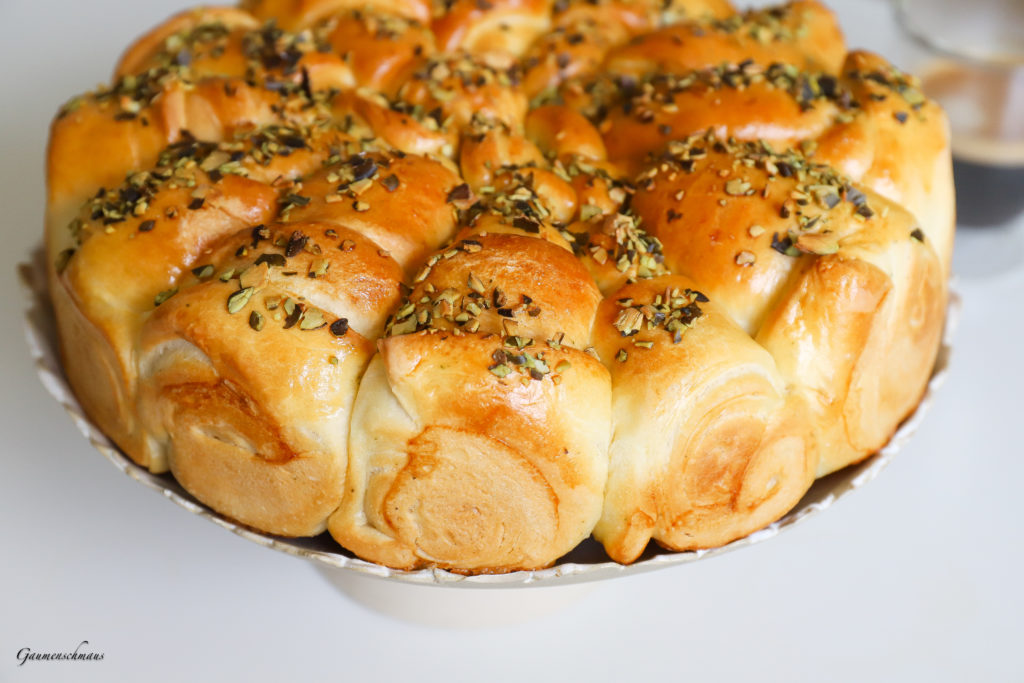 Diese Germblume erinnert in seiner Herstellung an einen Blätterteig. Die Teigkugeln werden flachgerollt, mit Butter bestrichen und von einem weiteren