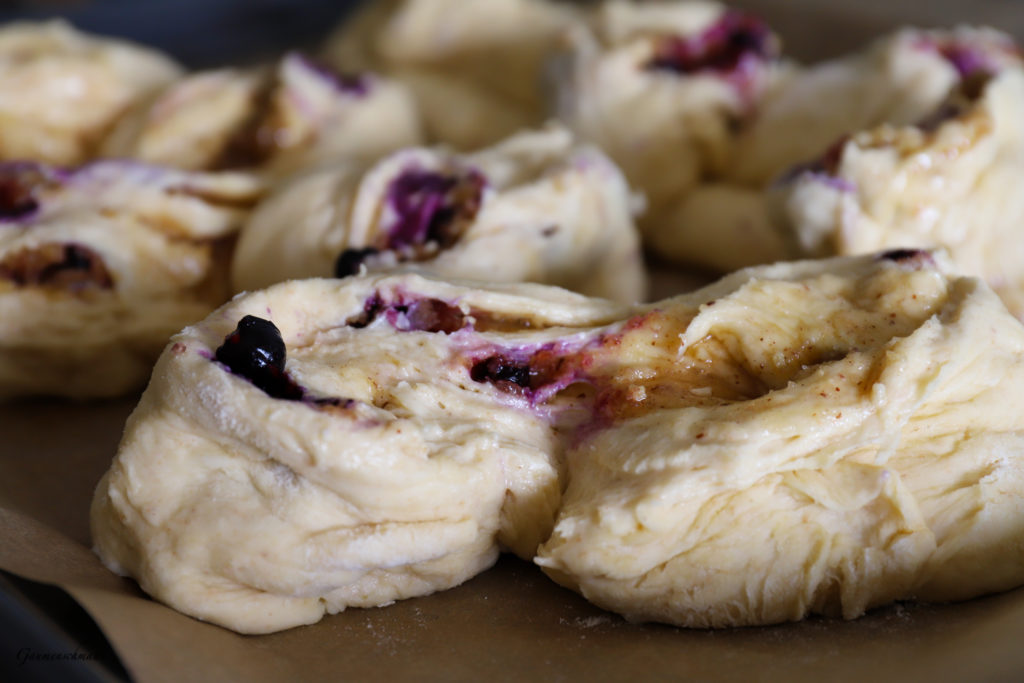 Regen, Oktober, bunte Bäume und Blätter. Was passt hier besser dazu, als ein weicher Germteig? Die Heidelbeer-Zupfschnecken mit Zimt standen